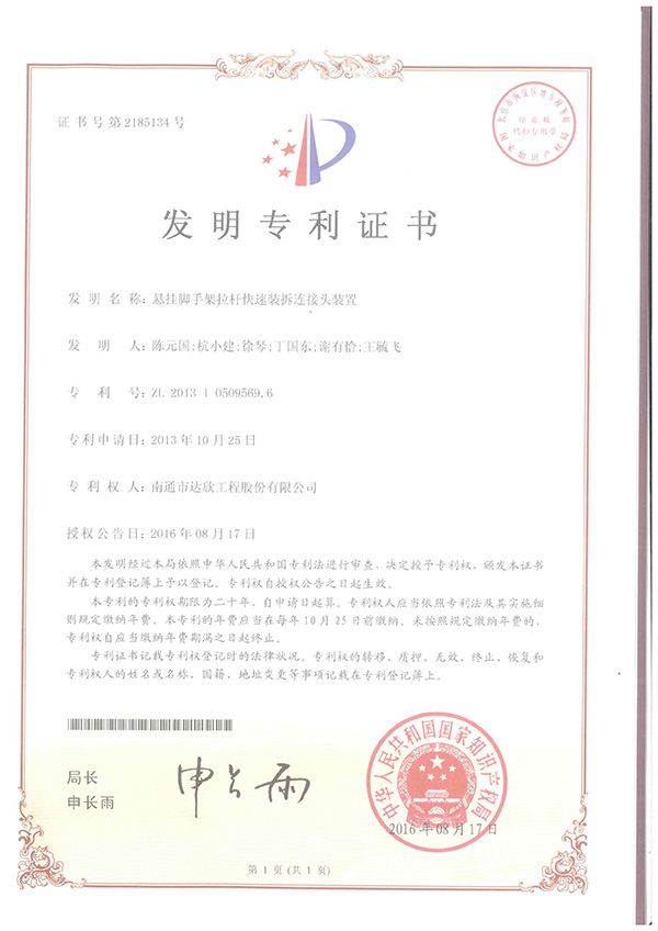 由第一工程公司申報的《懸掛腳手架拉桿快速裝拆連接頭裝置》成功獲國家知識產(chǎn)權(quán)局授權(quán),于2016年8月17日獲得國家發(fā)明專利證書。該發(fā)明專利系工程公司《無攬風(fēng)繩獨立桅桿吊裝勁性鋼柱專用夾具》后又一國家發(fā)明專利。