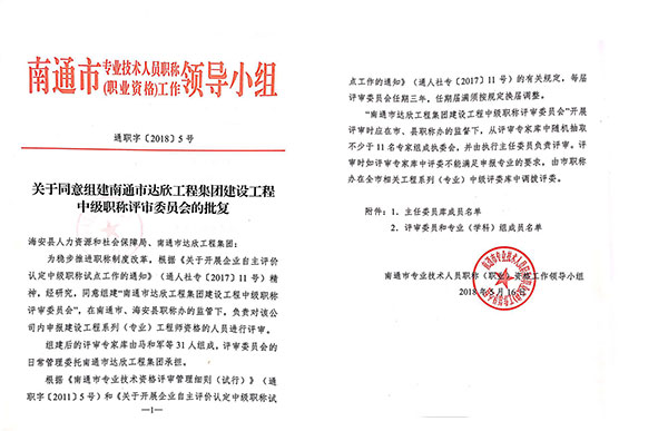 自2018年起,達(dá)欣集團(tuán)將在縣、市職稱辦的領(lǐng)導(dǎo)下,自主對(duì)本公司內(nèi)申報(bào)國(guó)家級(jí)建設(shè)工程系列(專業(yè))工程師資格的人員進(jìn)行評(píng)審。只要符合中級(jí)職稱申報(bào)條件,均可在南通職稱網(wǎng)通過“南通市達(dá)欣工程集團(tuán)建設(shè)工程中級(jí)專業(yè)技術(shù)資格評(píng)審委員會(huì)”進(jìn)行申報(bào)。此次公司獲得中級(jí)職稱自主評(píng)價(jià)認(rèn)定資格,既是上級(jí)主管部門對(duì)公司人才管理工作的肯定,也是公司近年來重視實(shí)施人才戰(zhàn)略,加快人才引進(jìn)與培養(yǎng),企業(yè)技術(shù)人員綜合素養(yǎng)水平能力不斷提高的有效體現(xiàn)