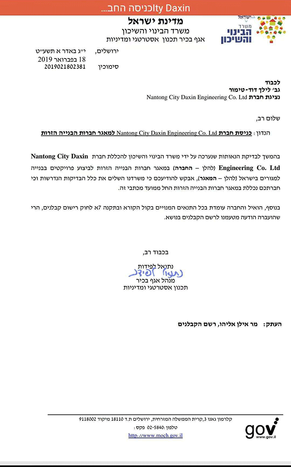 近年來,達(dá)欣集團(tuán)積極響應(yīng)國家“走出去”和“一帶一路”戰(zhàn)略,大力發(fā)展國際工程承包業(yè)務(wù),此次中標(biāo)以色列承包商資格,將為集團(tuán)進(jìn)一步拓展海外市場(chǎng)提供新的契機(jī)。