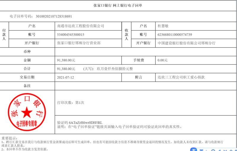 同事們?cè)诘弥闆r后,紛紛伸出援手,獻(xiàn)出一份愛(ài)和情誼,在大家的共同努力下,共籌到善款91380元,并于第一時(shí)間匯到杜慧敏賬戶(hù)里。希望她能盡快走出病痛的折磨,早日康復(fù)!