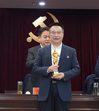 會上,集團(tuán)黨委書記劉厚純上臺接受表彰,領(lǐng)取了黨建“魯班獎”小金人獎杯。