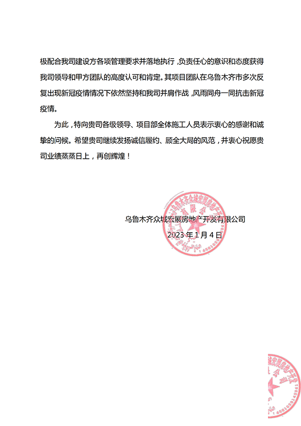 1月10日,集團(tuán)公司收到來自烏魯木齊眾城宏展房地產(chǎn)開發(fā)有限公司的一封表揚(yáng)信,信中對集團(tuán)第十一公司烏魯木齊碧桂園·黃金時(shí)代二期工程項(xiàng)目部,自2022年8月10日烏魯木齊市實(shí)施新冠疫情防控以來,項(xiàng)目部全體人員在疫情防控和項(xiàng)目建設(shè)中表現(xiàn)出的責(zé)任與擔(dān)當(dāng)表示感謝。內(nèi)容詳見附件: