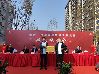 10月19日,第三工程公司承建的安居?水岸瀾苑項目工程質量現(xiàn)場觀摩會暨廣平縣2023年度建設質量樣板工程頒獎儀式隆重舉行。邯鄲市建筑工程質量管理站副站長徐金峰、張少軍科長、廣平縣建筑工程質量監(jiān)督站,廣平縣在建工程各施工單、監(jiān)理單位、地產(chǎn)開發(fā)商代表等120余人參加活動。安居?水岸瀾苑項目經(jīng)理吉光代表公司接受“2023年度建設質量樣板工程”獎牌。