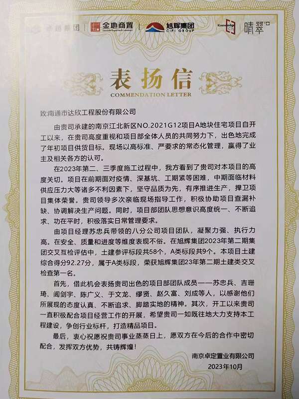 近日,公司收到南京卓定置業(yè)有限公司發(fā)來的表揚(yáng)信,對公司南京G12項(xiàng)目管理團(tuán)隊(duì)出色完成年初項(xiàng)目預(yù)期目標(biāo),以及在項(xiàng)目建設(shè)中表現(xiàn)出的專業(yè)、認(rèn)真、負(fù)責(zé)的態(tài)度,不畏困難、迎難而上的精神,高標(biāo)準(zhǔn)、嚴(yán)要求的工作作風(fēng)提出贊揚(yáng)和認(rèn)可。此外,該項(xiàng)目旭輝集團(tuán)2023年第二期土建類檢查榮獲第一名的好成績。