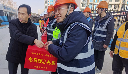 1月13日,南通市總工會黨組成員、經(jīng)審會主任周正秋,南通市總工會權(quán)益保障部部長趙周恒一行,來到達(dá)欣集團(tuán)南通R23005地塊項目建設(shè)現(xiàn)場,開展“工會在身邊 真情暖江海”2025年春節(jié)送溫暖活動,為奮戰(zhàn)在一線的工作人員送上冬日暖心禮包和新春的祝福與慰問。