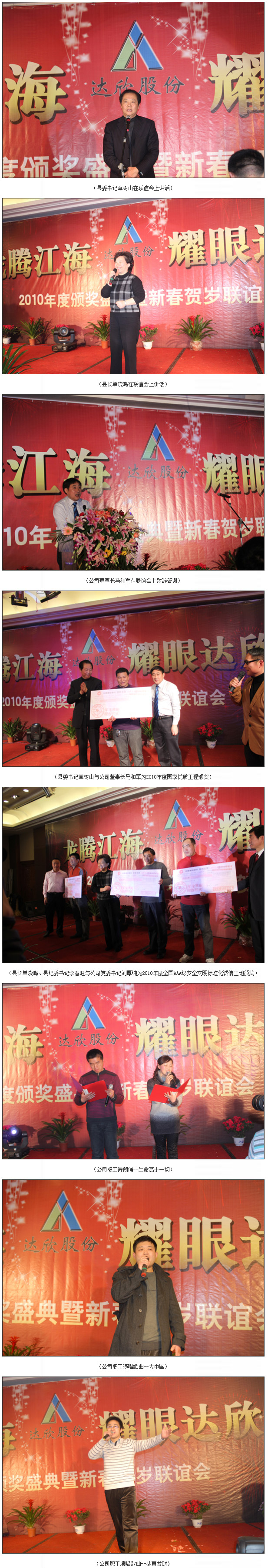 在喜慶樂典和主持人高亢激昂的道白后,首先回睦了2010年公司精彩的展示專題片,公司董事長馬和軍隨后進行了致辭答謝。他回顧了公司一年來所取得的輝煌成績,感謝社會各界及公司全體同仁們的努力,并對公司的未來發(fā)展之路描繪了藍圖;接著,縣委書記章樹山發(fā)表重要講話,他指出,建筑業(yè)是我縣的傳統(tǒng)產(chǎn)業(yè),也是一個富民強勢產(chǎn)業(yè),還是我縣財政收入的重要來源之一,作為縣內(nèi)的骨干企業(yè),達欣公司步入了公司歷史以來發(fā)展最快、榮譽最高、分配最多、貢獻最大的時期,他希望公司要加快發(fā)展,高起點定位,突出重點,好中求快,實現(xiàn)達欣新飛躍。